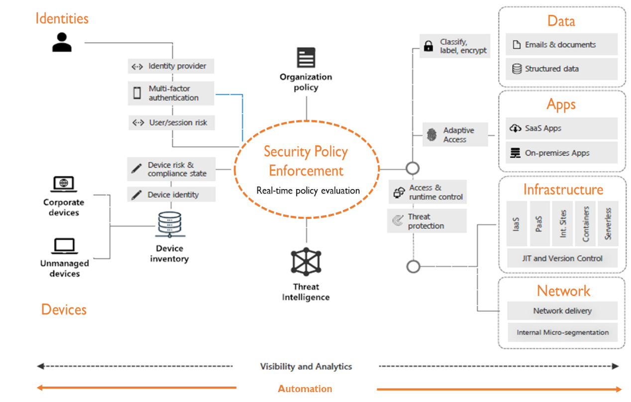 Zero Trust is a philosophy rather than a tool that needs multiple technologies to put together a ZT approach. The diagram below shows how the major components of the Zero Trust model work together to deliver end-to-end coverage.