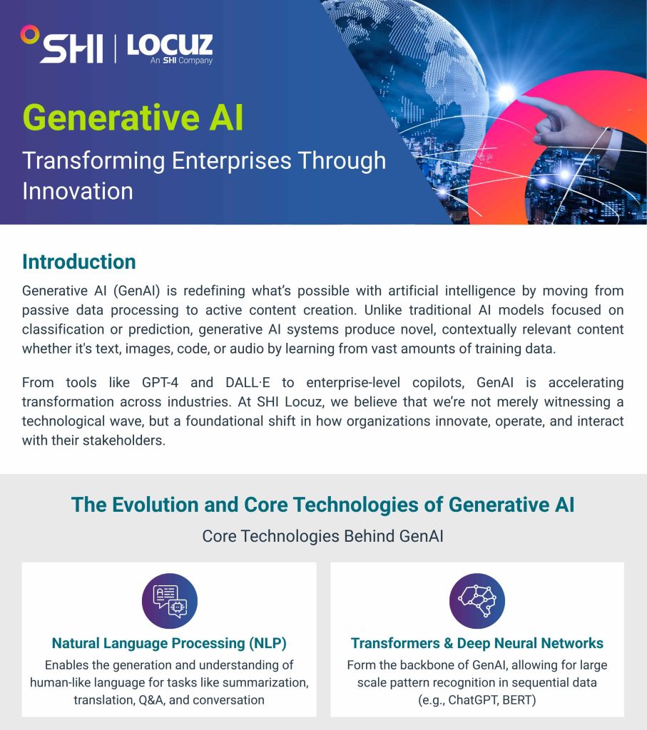This whitepaper explains how GenAI transforms industries by creating novel content using advanced technologies such as NLP, transformers, GANs, and reinforcement learning. It highlights GenAI applications across the retail, healthcare, finance, manufacturing, and automotive sectors. Key challenges, including data privacy, explainability, ethics, and legacy system integration, are addressed with SHI India (Formerly Locuz)’s mitigation strategies. The paper details SHI India (Formerly Locuz)’s enterprise-ready GenAI framework, which includes AI accelerators, MLOps, and privacy-first data strategies. Real-world case studies demonstrate significant business improvements. It concludes with strategic recommendations for adopting GenAI, emphasizing measurable impact, governance, and change management. Overall, it guides enterprises on safely scaling GenAI to drive innovation and efficiency.